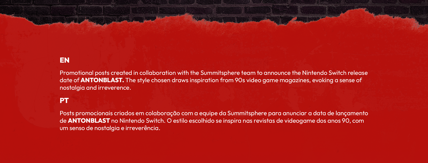 Em colaboração com o estúdio Summitsphere, criei cartazes promocionais estilo retro anunciando a data de lançamento de ANTONBLAST para Nintendo Switch.
